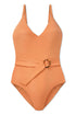 立體哈密瓜細紋材質,金黃古銅色調一件式連身泳裝,性感大V領及U型挖背設計,腰帶裝飾玳瑁配件,流露復古的性感氣息。胸墊可替換。內全襯裡,舒適修身高質感。