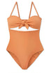 Be a queen in this Babycomb textured, golden cantaloupe number. This V-neck one piece features a scoop back and waist belt with tortoise hardware accent.