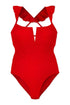Make a statement without saying a word with our sultry Jackie one-piece, our best-selling deep V-wire front one-piece is remastered in our signature Red Poppy jacquard fabric. Adjustable criss-cross back straps lend subtle support while a ruffle flounce at the shoulders add a sweet feminine touch.