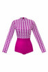 Color blocking knit jacquard houndstooth top with a vibrant magenta boy short bottom. This long sleeved one-piece provides ultimate sun protection while still giving fashion. Zips up in back with a long zipper pull just like wet suits.