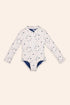 Nakuru 系列中的 Dover 防曬型連身防磨泳裝綴滿精緻的幾何花苞紋理,正面配有拉鍊設計,是件好穿脫的防磨泳裝,並採用防曬長袖設計,猶如非洲草原上那片燦爛的花海,襯托小寶貝的天真可愛,讓孩子在夏日玩水時,太陽不會成為一項負擔。