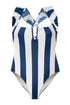 Take on the high seas in comfort and class with our favorite one piece Elodie. Ruffles and gold ring details add feminine elegance while a center U-wire bra-top gives a subtle peek of cleavage.