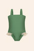 這款防曬型寶寶泳裝採用親膚柔軟面料,綴有甜美的褶邊剪裁,肩帶以褶皺設計增加舒適感,讓小寶貝輕鬆享受玩水樂趣。
